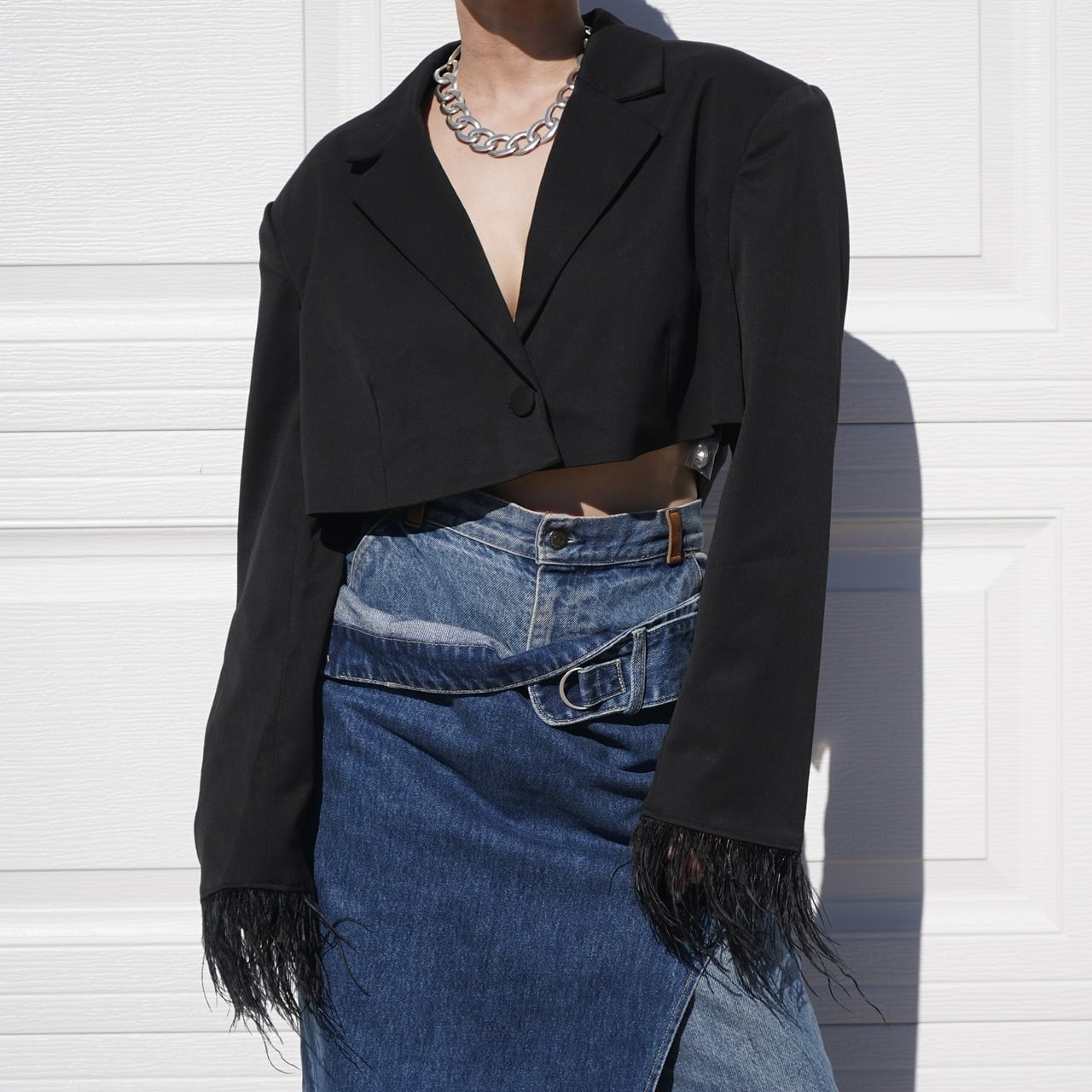 ・肩幅44cm, 身幅51cm, 袖丈59cm(フェザー部分除く)着丈39cm