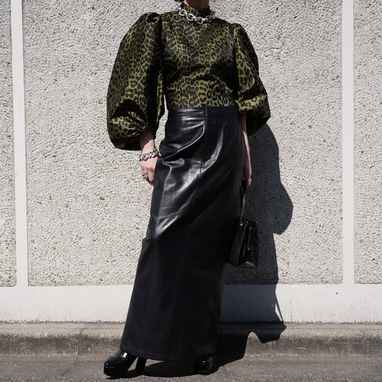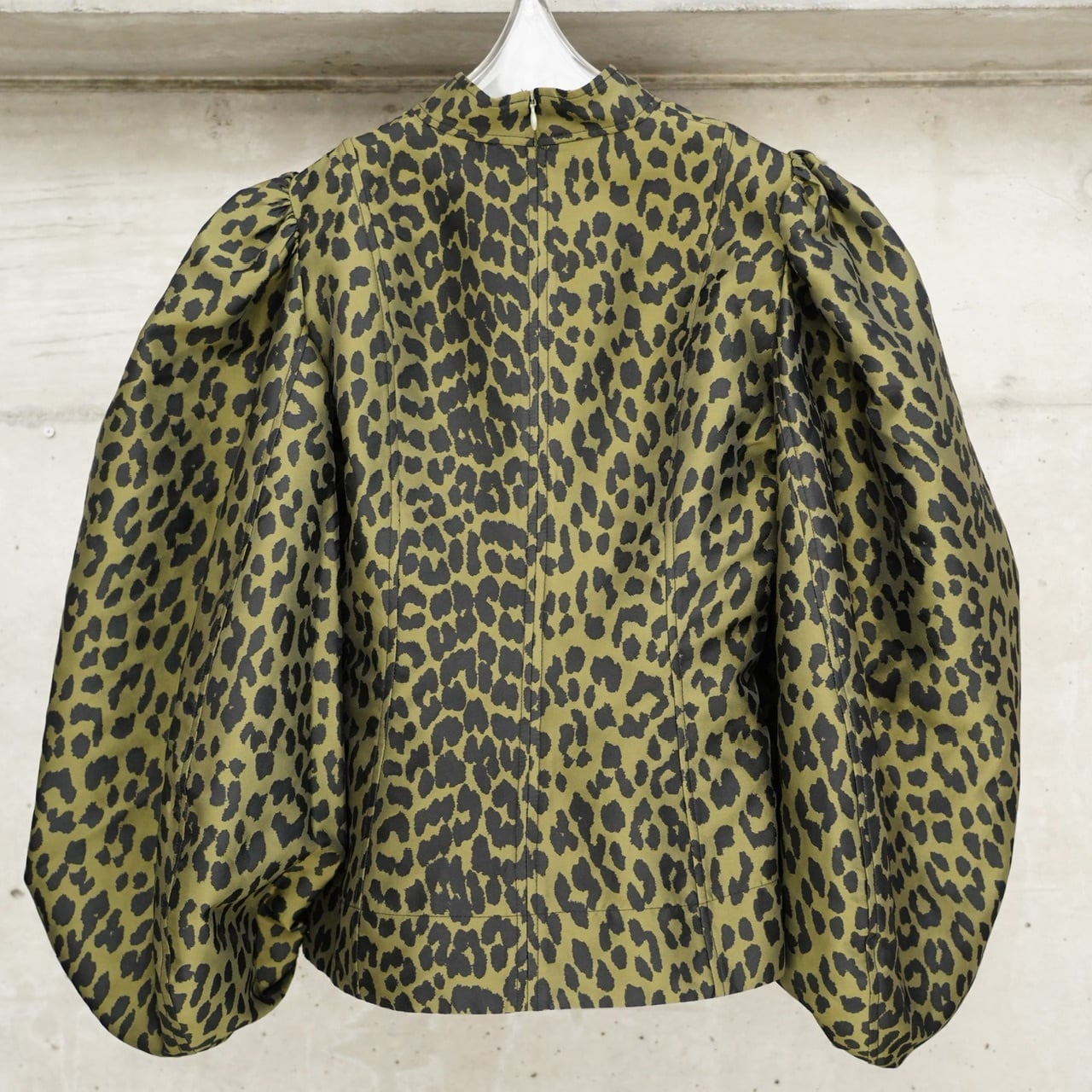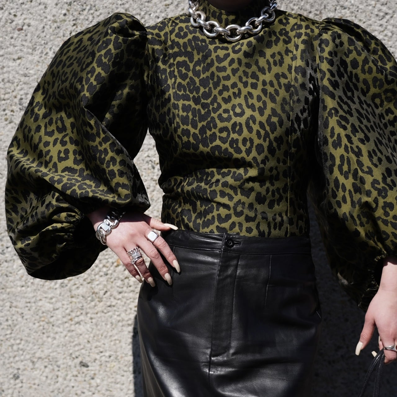 スーパーボリュームスリーブに加えて、強めなテキスタイルと艶っとした質感がフェミニンでありモードです。