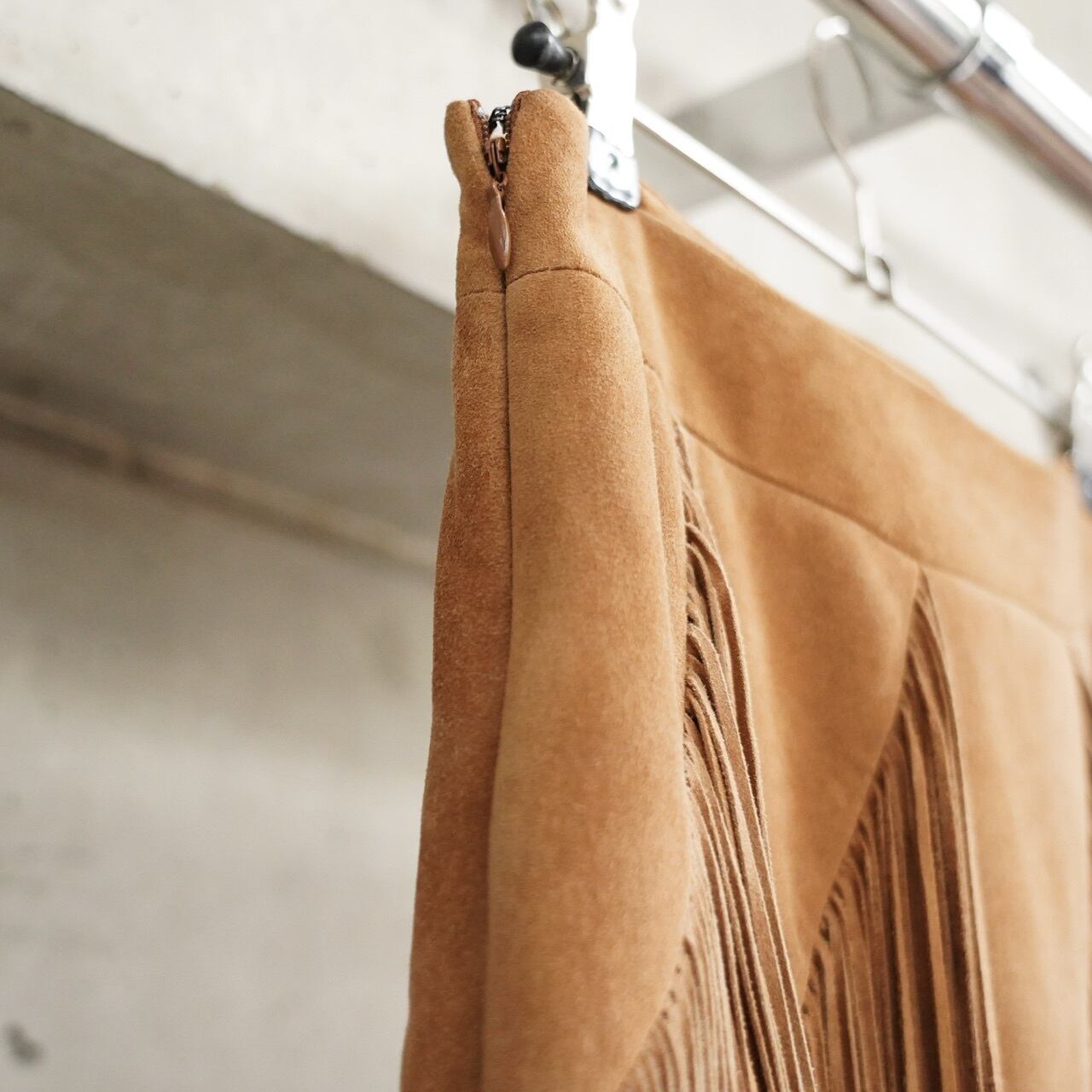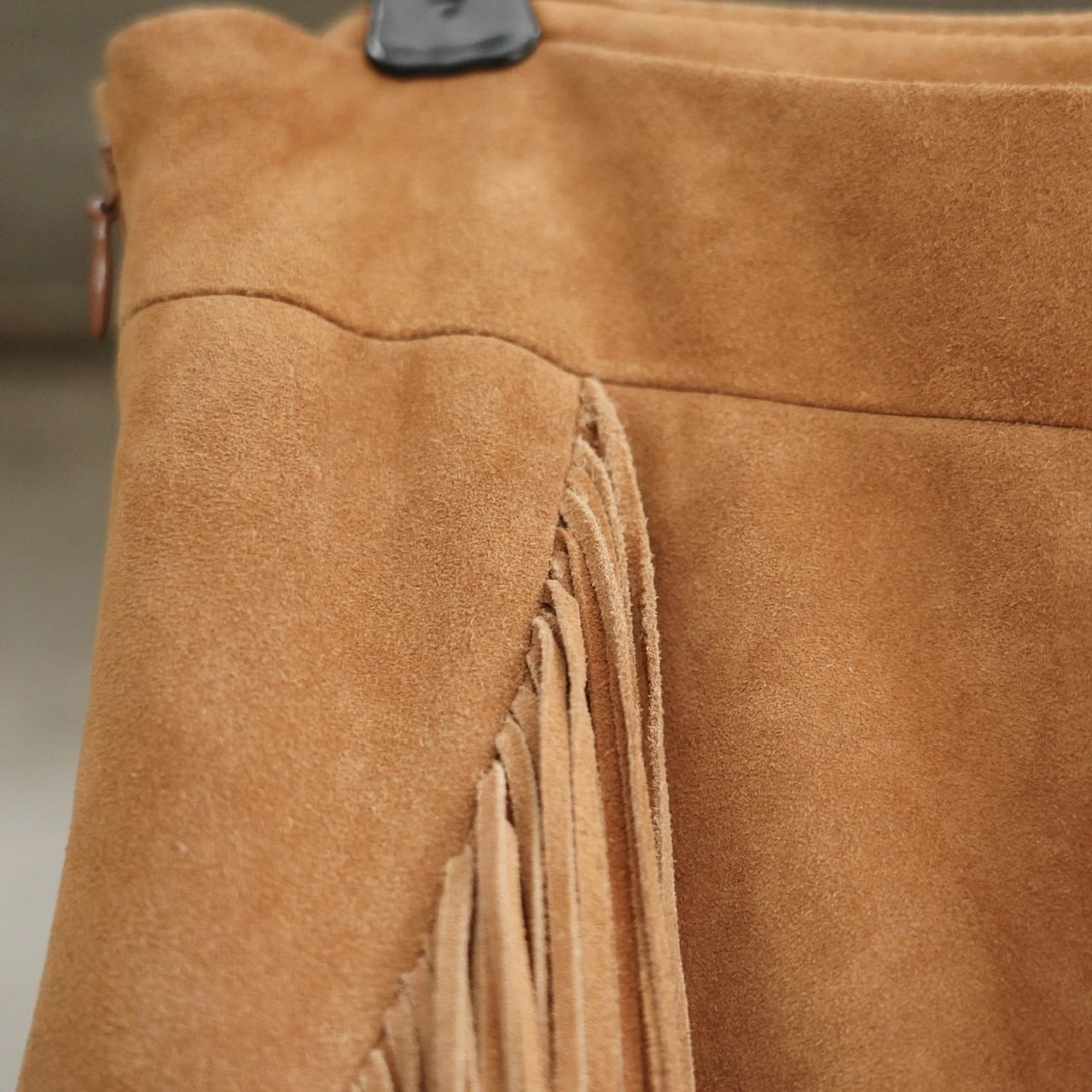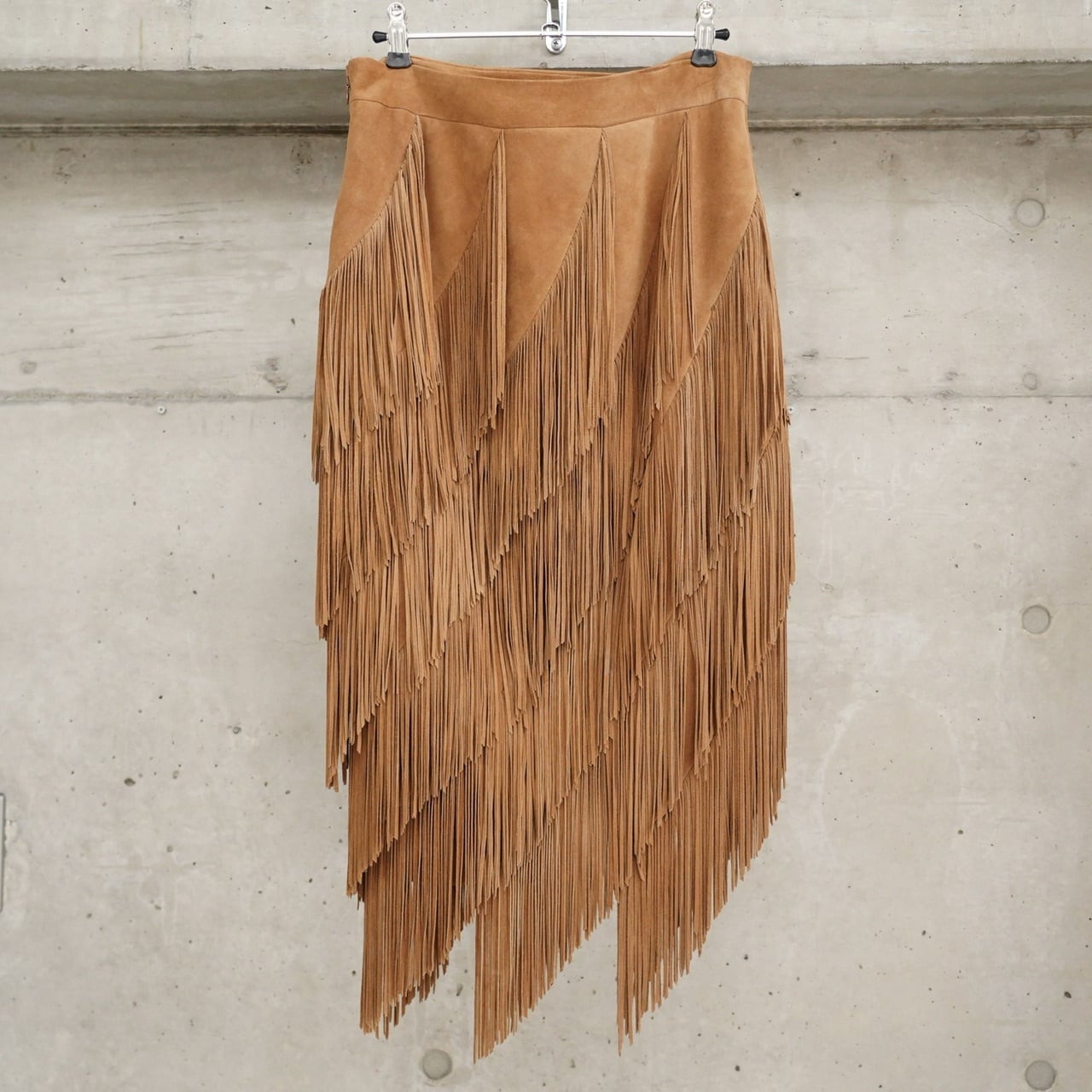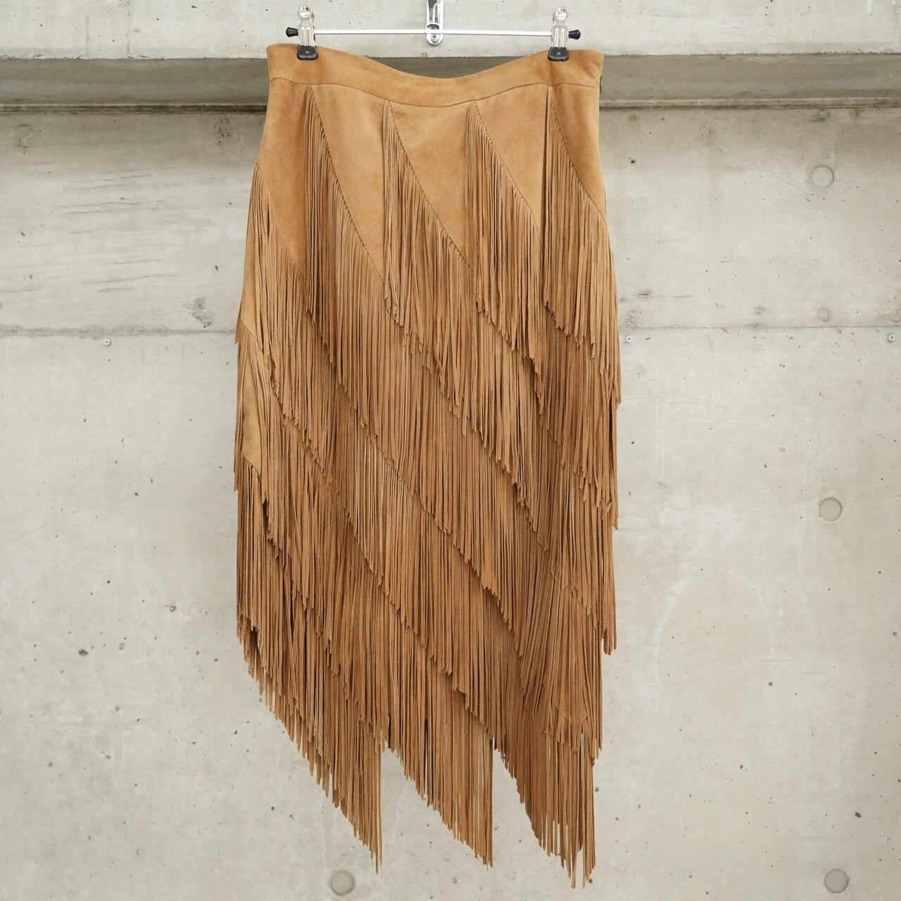 贅沢にたっぷりとあしらわれたフリンジがポイントのレザースカートです。