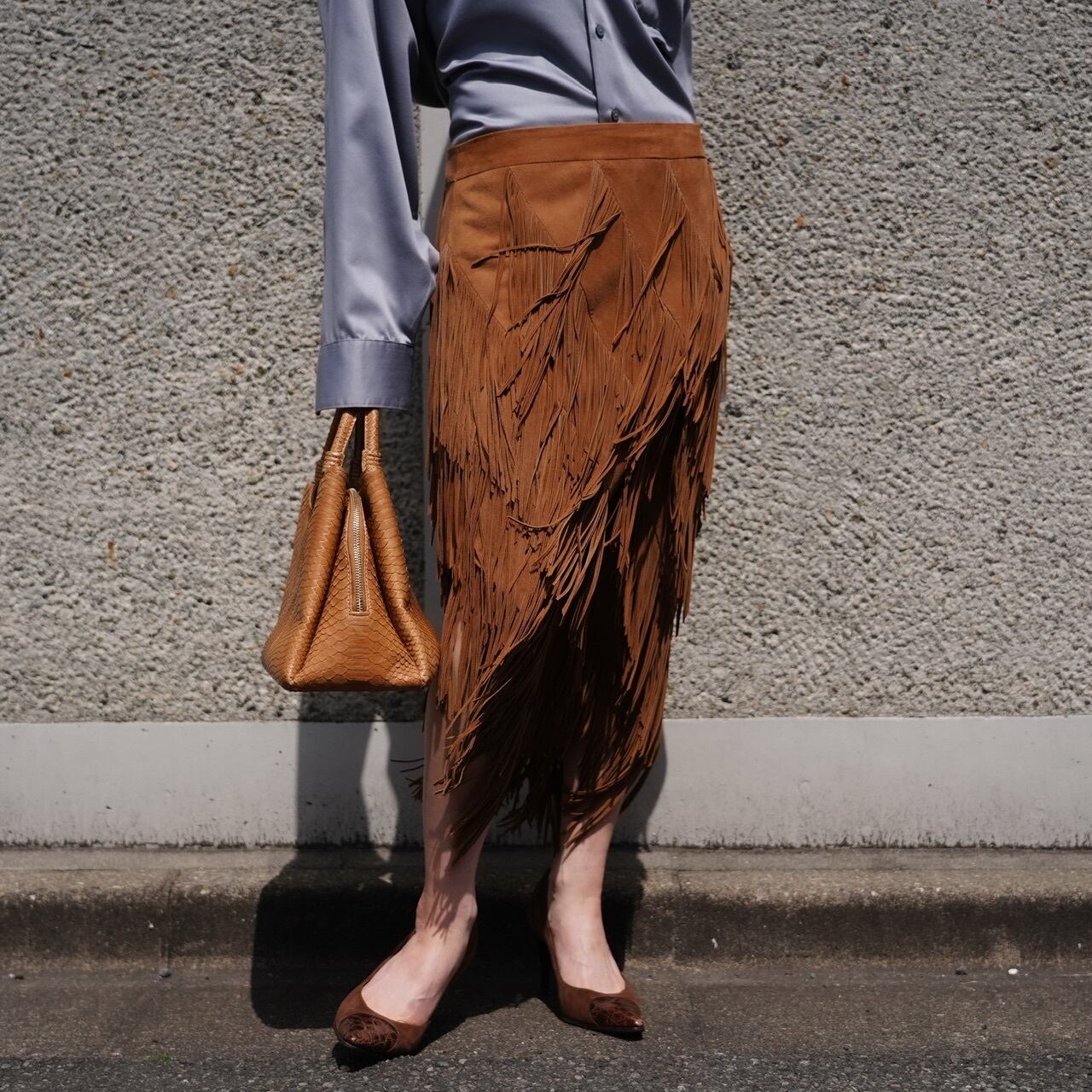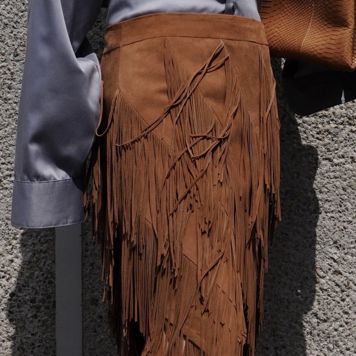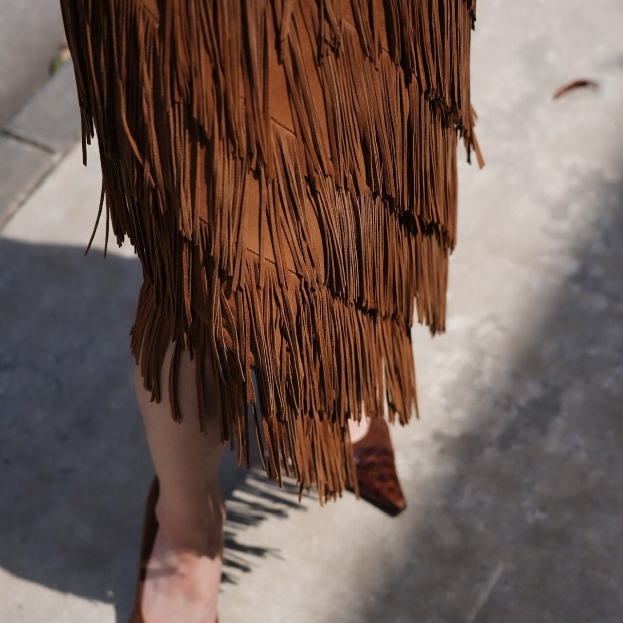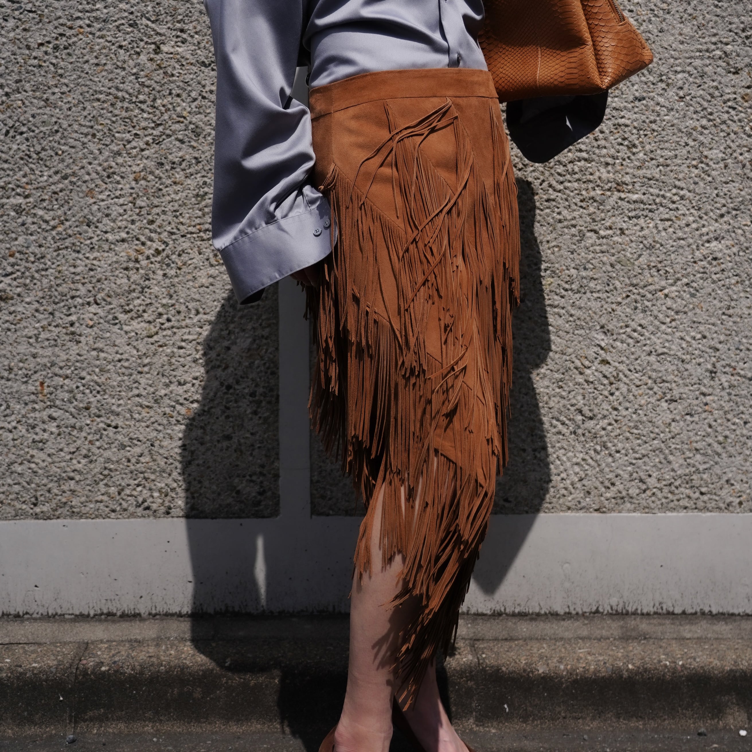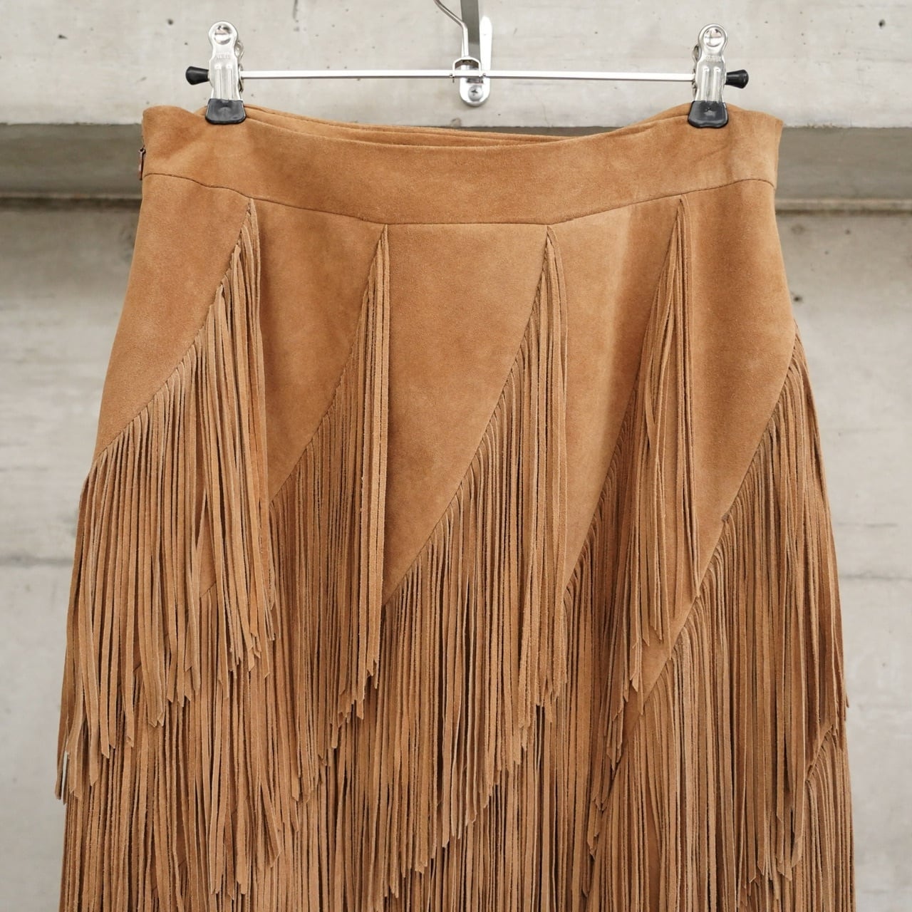 贅沢にたっぷりとあしらわれたフリンジがポイントのレザースカートです。