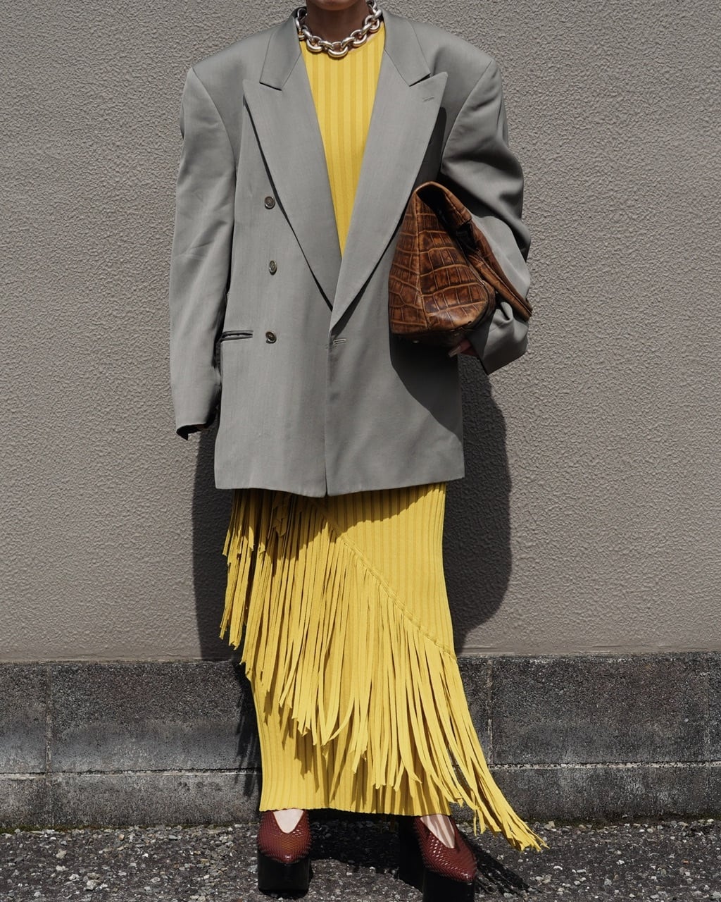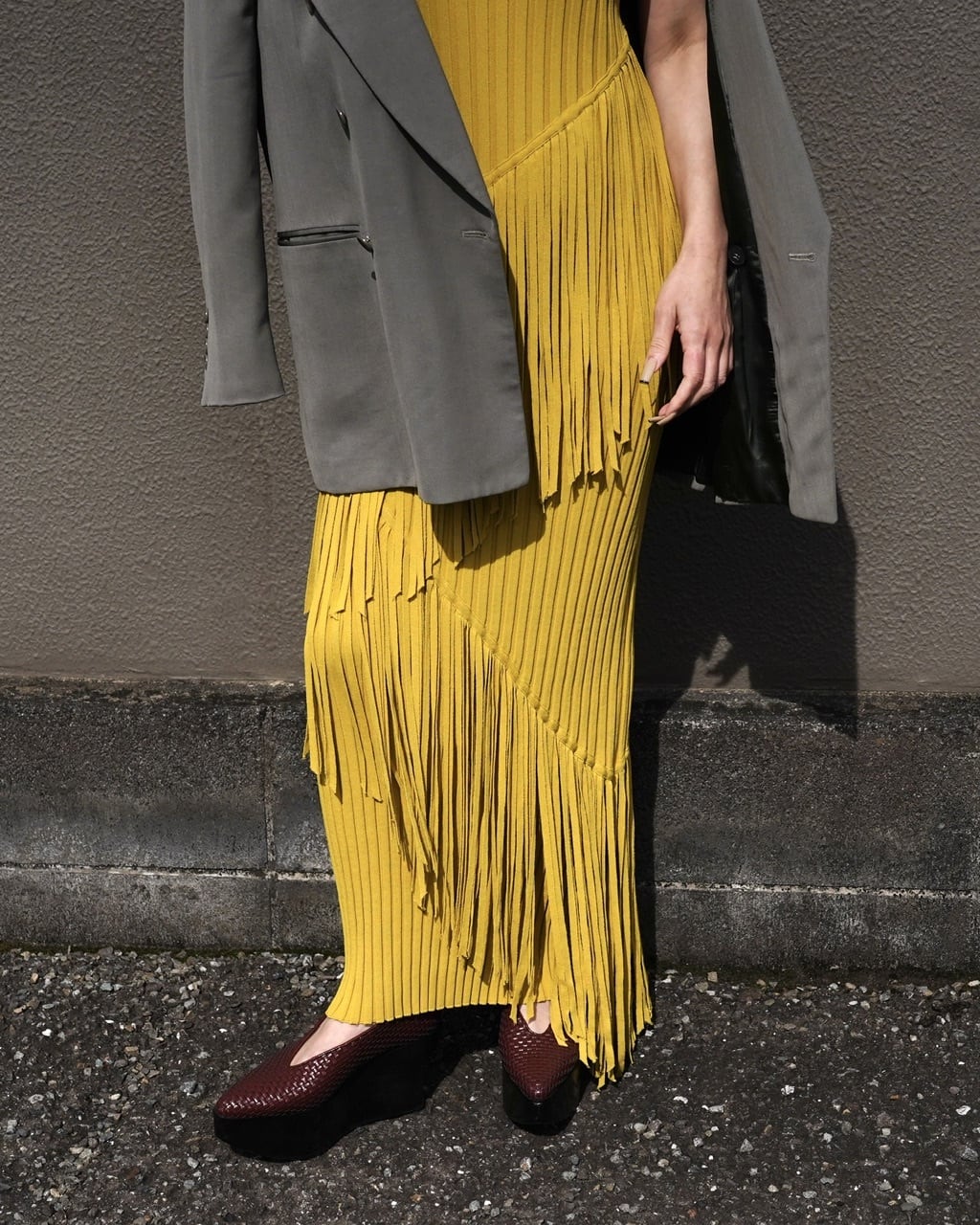 アシンメトリーに施されたフリンジや鮮やかな色味がポイントのロングドレス。