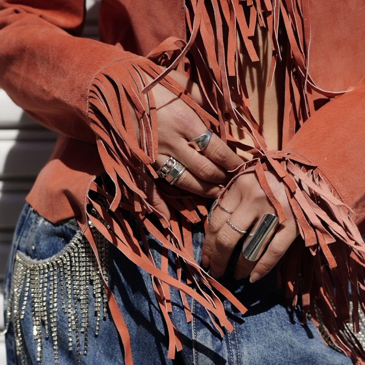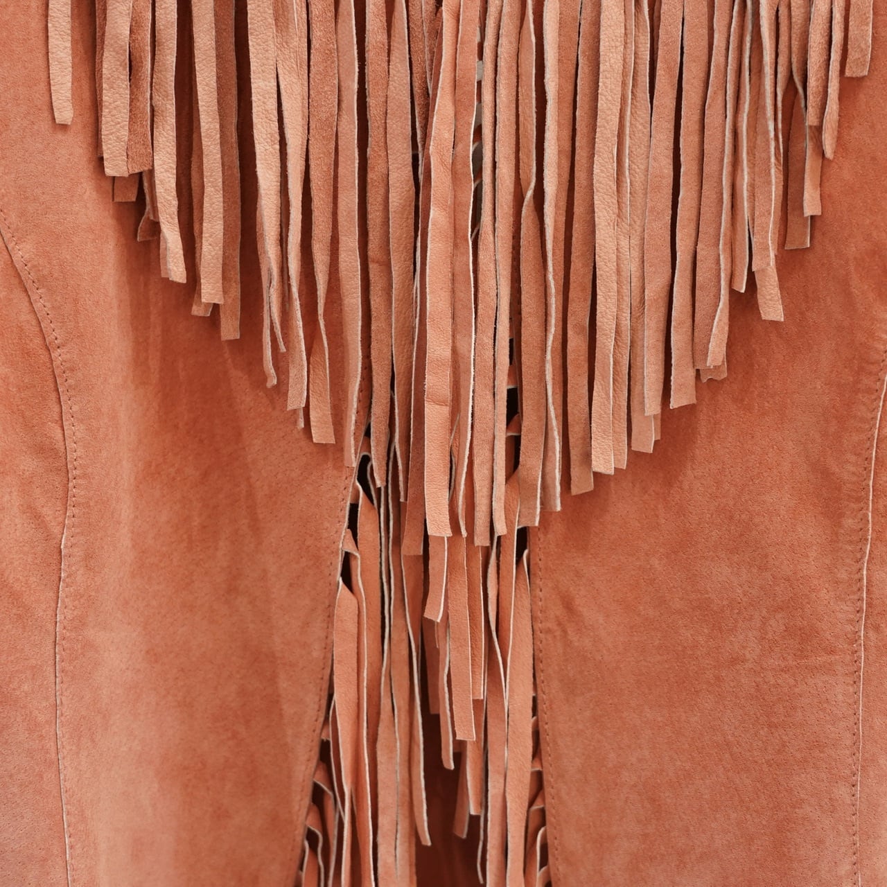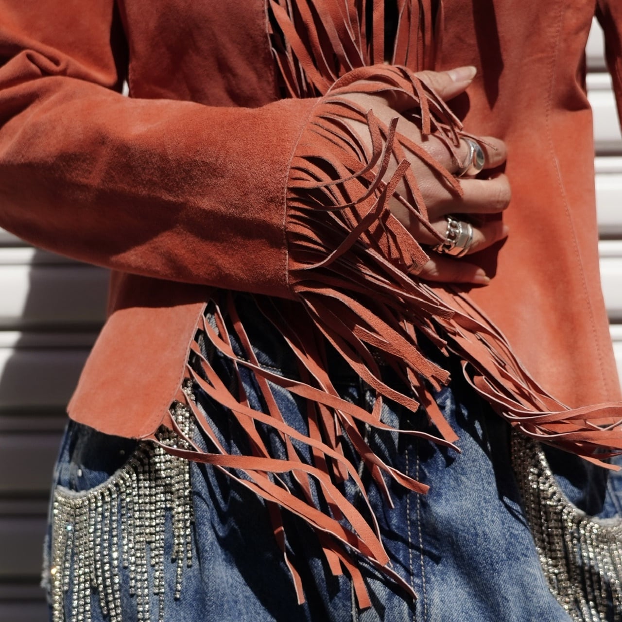 華やかな色味にたっぷりのフリンジが印象的な ジャケットです。