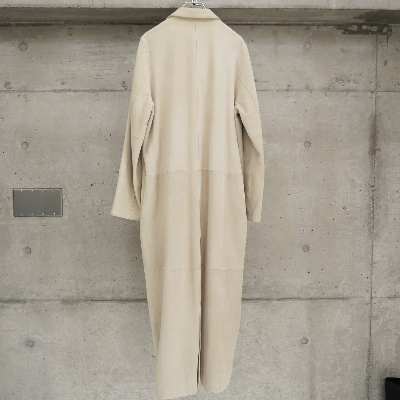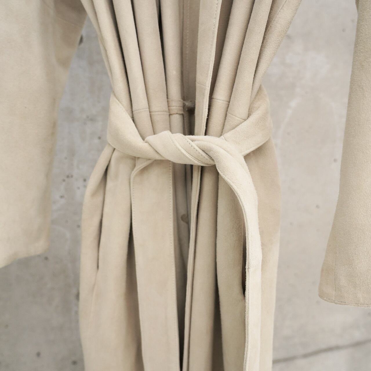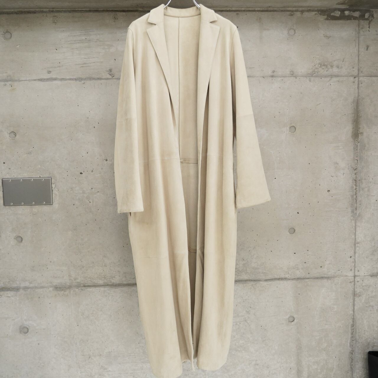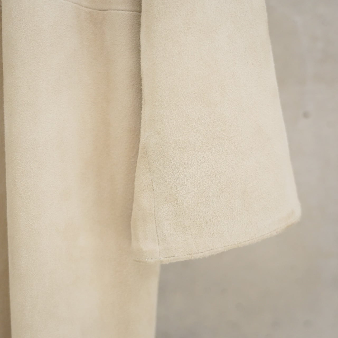 柔らかなスウェード素材のロングコートです。やや黄みがかった薄いベージュカラーもとても素敵です。