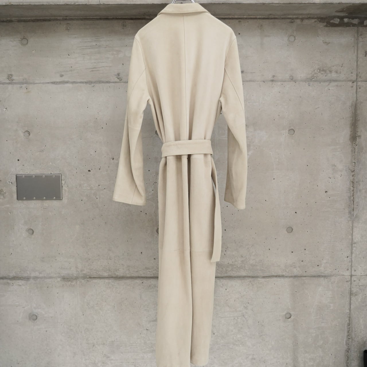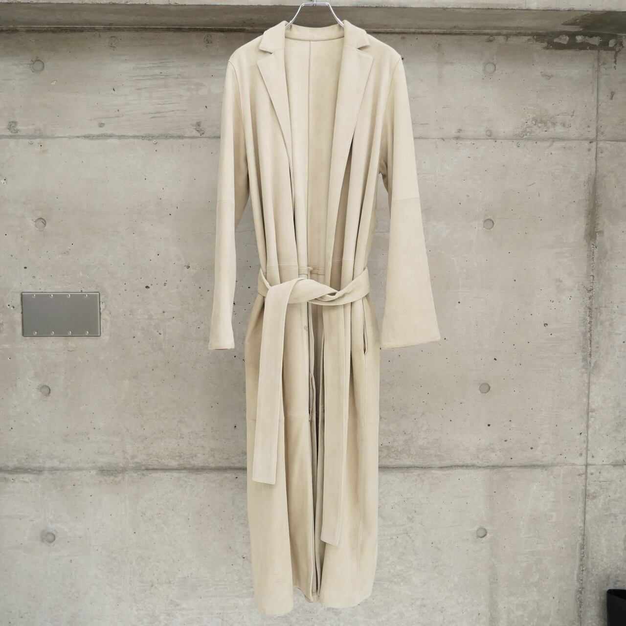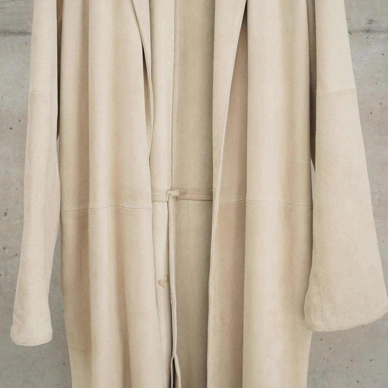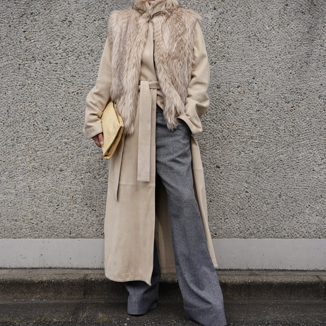 柔らかなスウェード素材のロングコートです。やや黄みがかった薄いベージュカラーもとても素敵です。