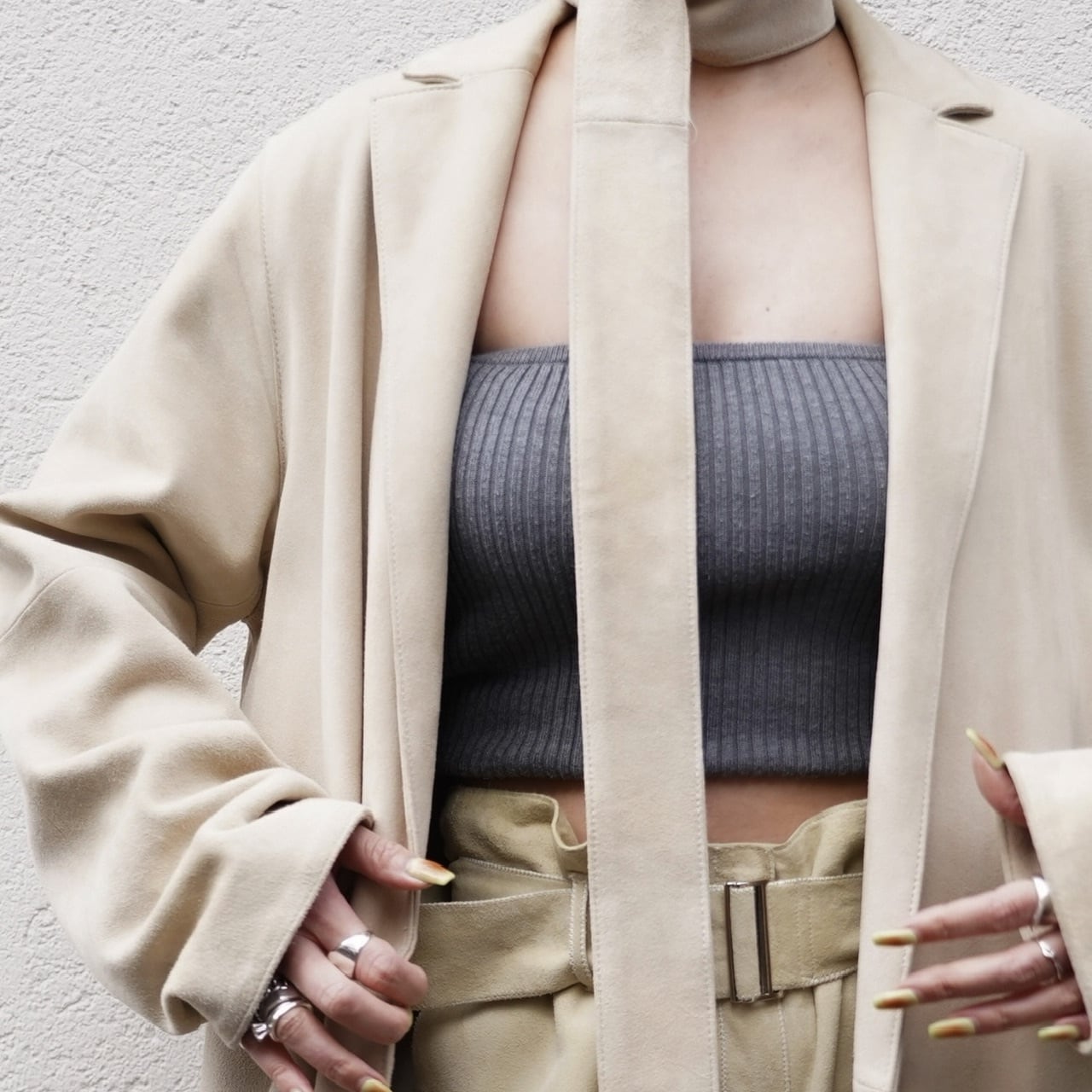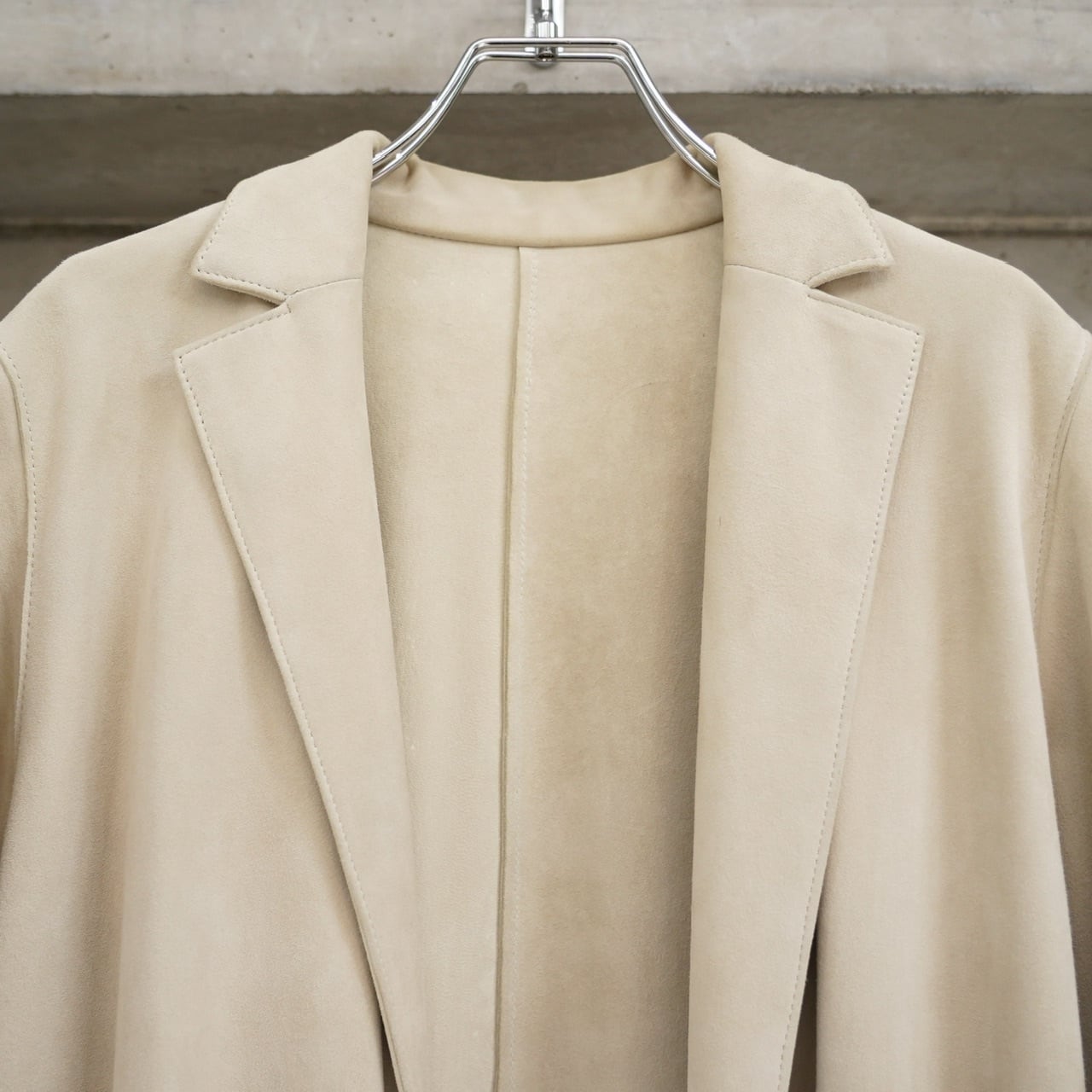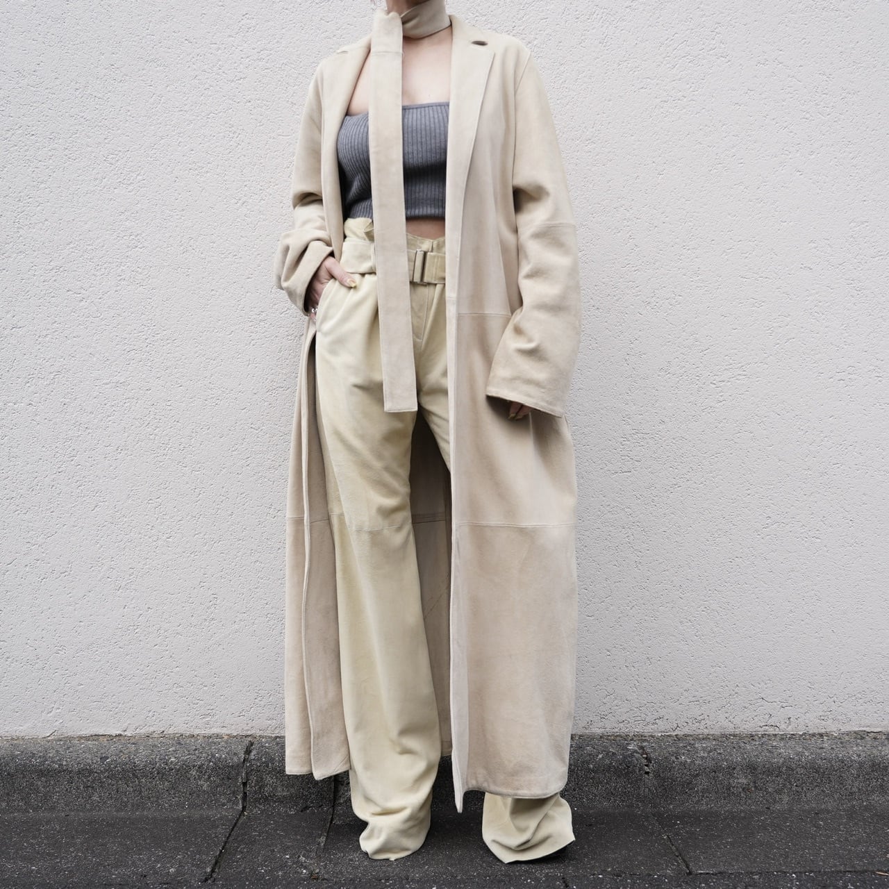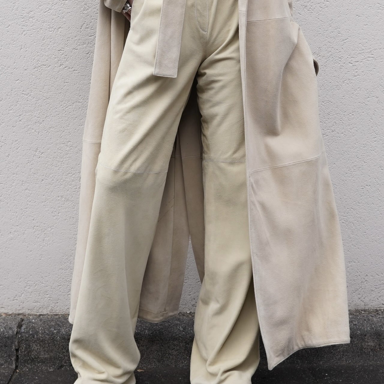 柔らかなスウェード素材のロングコートです。やや黄みがかった薄いベージュカラーもとても素敵です。