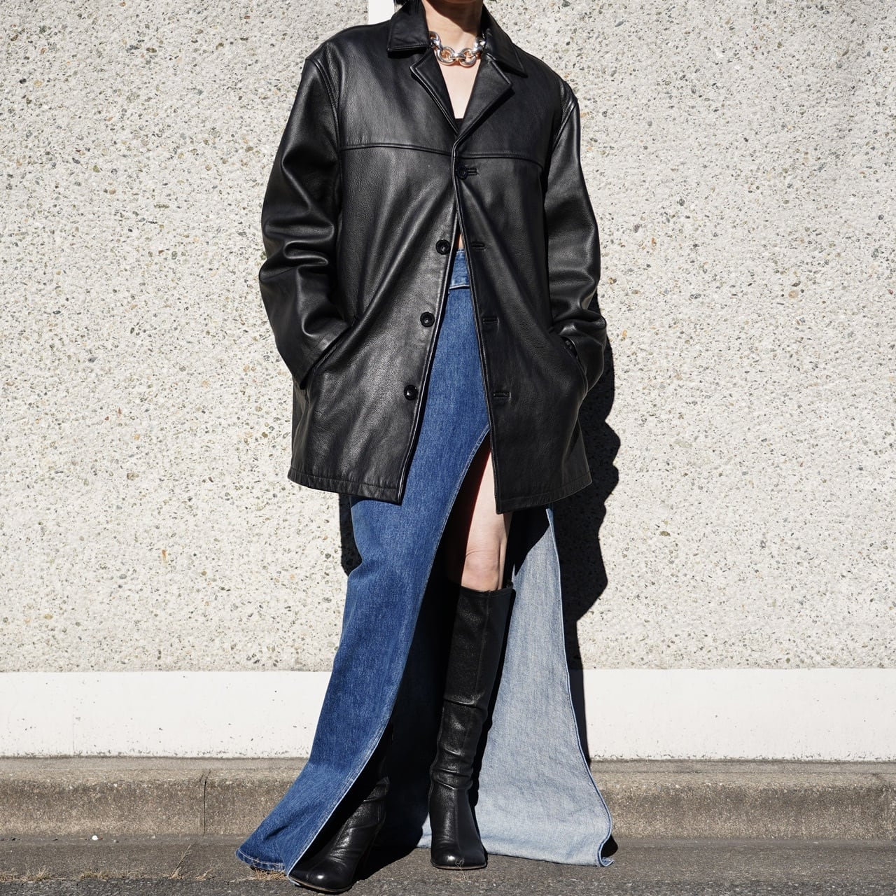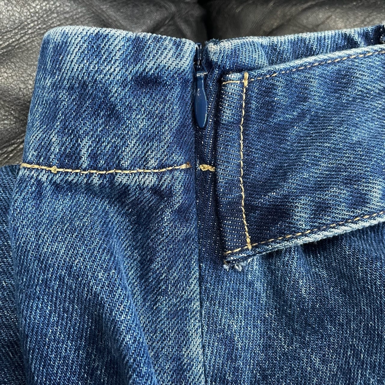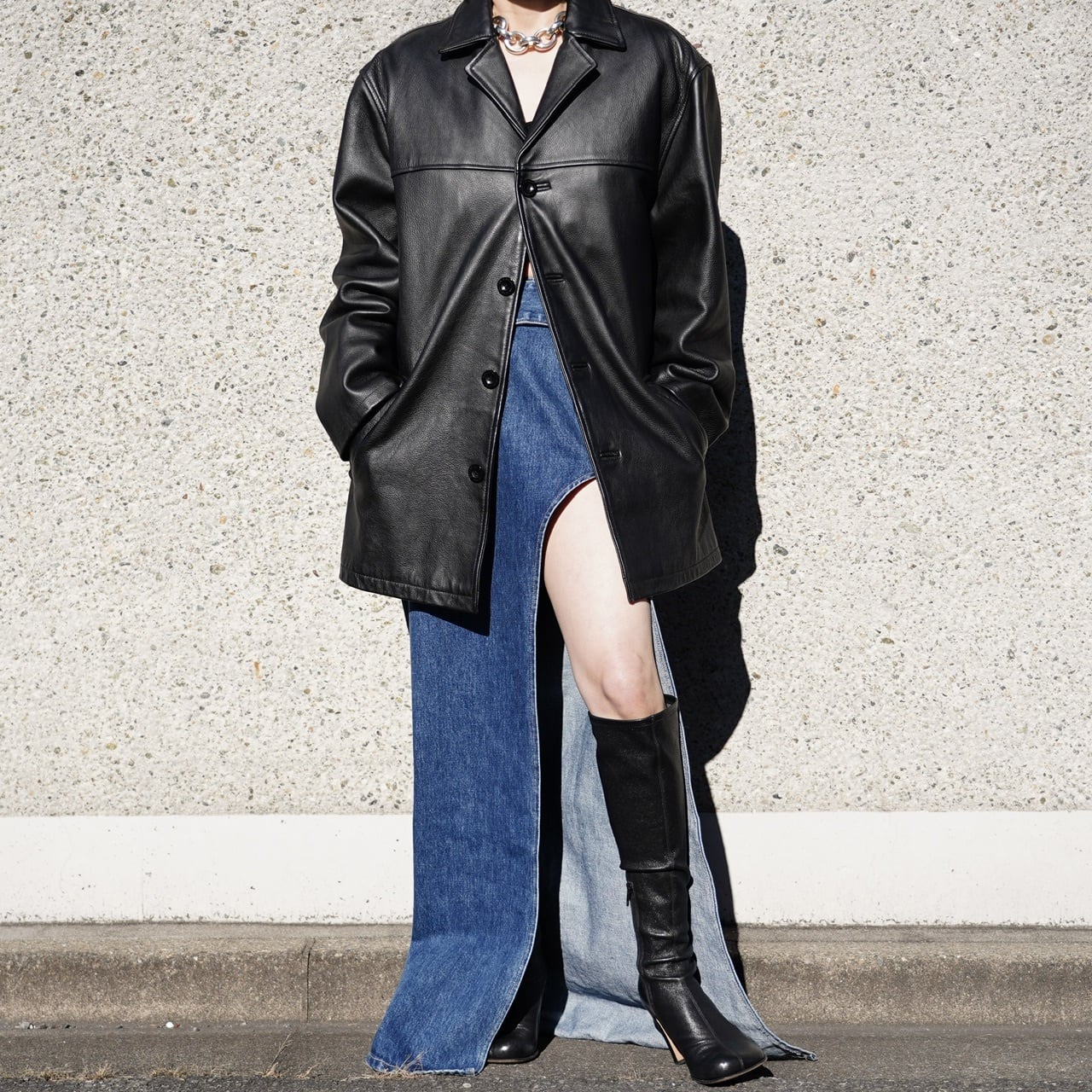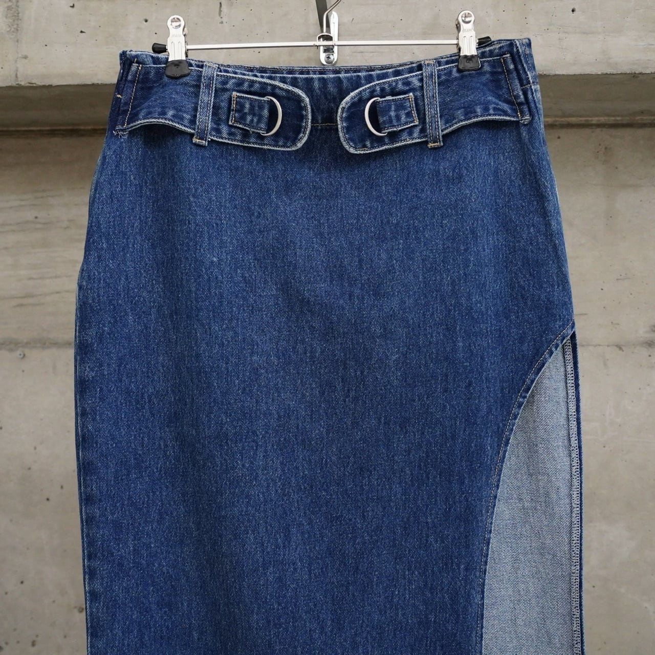 大胆なサイドのカットがポイントのデニムスカート。ボトムスのレイヤードも楽しめる一枚です。