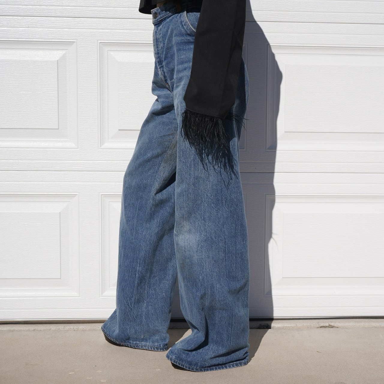 ボタンやジップからして、リーバイスのボディをリメイクしたもののようです。かなり丁寧な作りで、素人によるリメイクではありません。